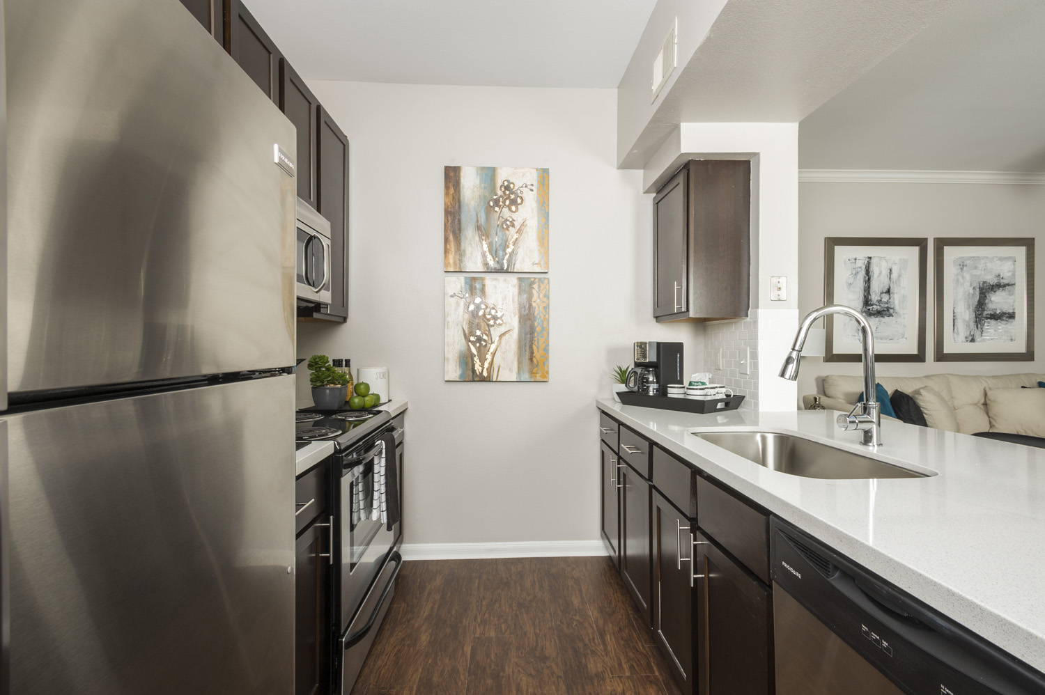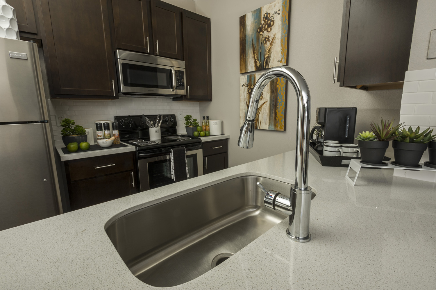 The gourmet kitchens are open concept and boast quartz counter-tops, dark wood cabinets, and stainless steel appliances. Throughout each home, you will enjoy custom nine-foot ceilings and double crown molding, suggesting an extra flourish of lofty luxury. Each residence provides the convenience of a full-size washer and dryer, a private patio or balcony to enjoy the lush landscaping as well as the option of a built-in desk in select models.