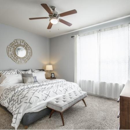 - Decorative crown molding and ceiling fans in bedroom and living space